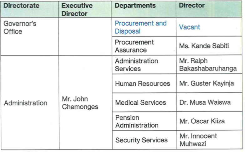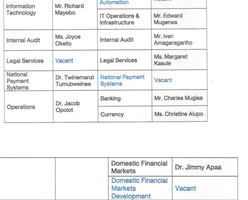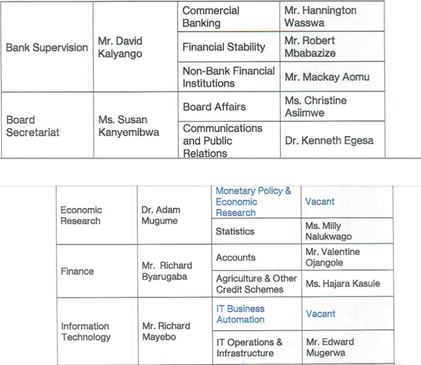 In a staff memo dated Monday, August 5, 2024, Atingi-Ego announced, “Following the Board's approval of the new organisational structure on 07 May 2024, and considering the skills, qualifications, competencies, and experience, we inform you that effective 06 August 2024, Heads of Directorate and Department at the rank of Executive Director and Director respectively have been deployed.”