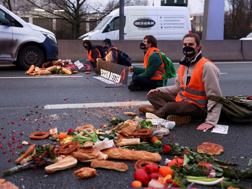 "Letzte Generation" (Last Generation) activists blocking a highway to protest against food waste and for reducing agricultural greenhouse-gas emissions, in Berlin, on February 4.