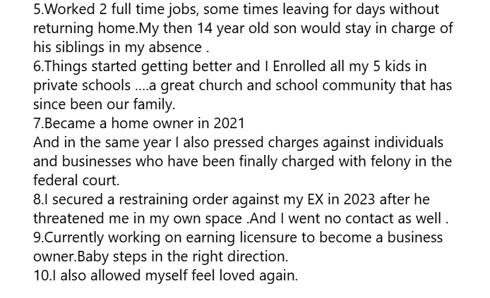 8. I secured a restraining order against my EX in 2023 after he threatened me in my own space. And I went no contact as well.