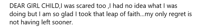 DEAR GIRL CHILD, I was scared too. I had no idea what I was doing but I am so glad I took that leap of faith…my only regret is not having left sooner.