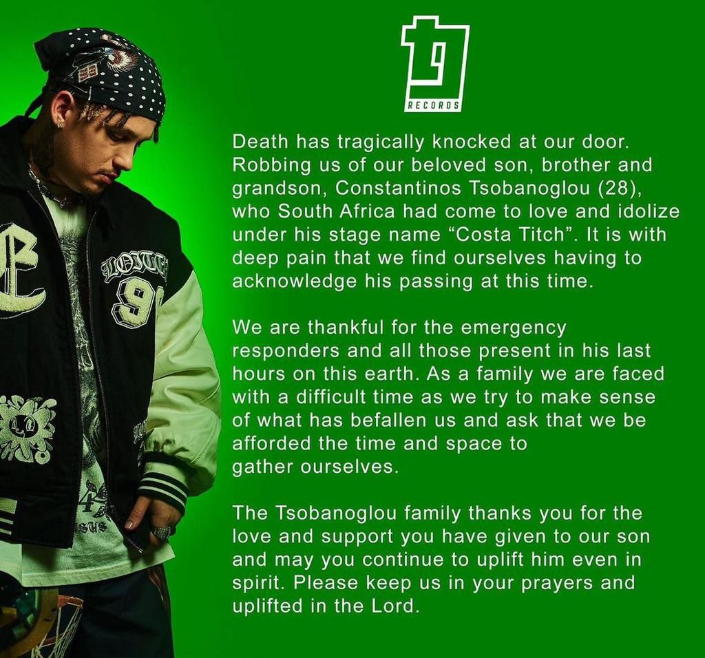 "Death has tragically knocked at our door. Robbing us of our beloved son, brother and grandson Constantinoz Tsobanoglou (28), who south Africa has come to love and idolize under his stage name Costa Titch.