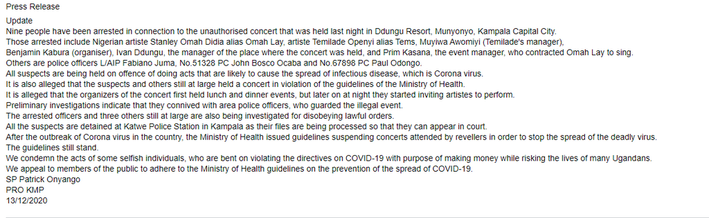 Ugandan Police statement when they arrested Omah Lay and Tems. [Facebook/UgandanPolice]