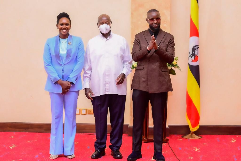 Phiona Nyamutoro and Eddy Kenzo posing with President Yoweri Museveni