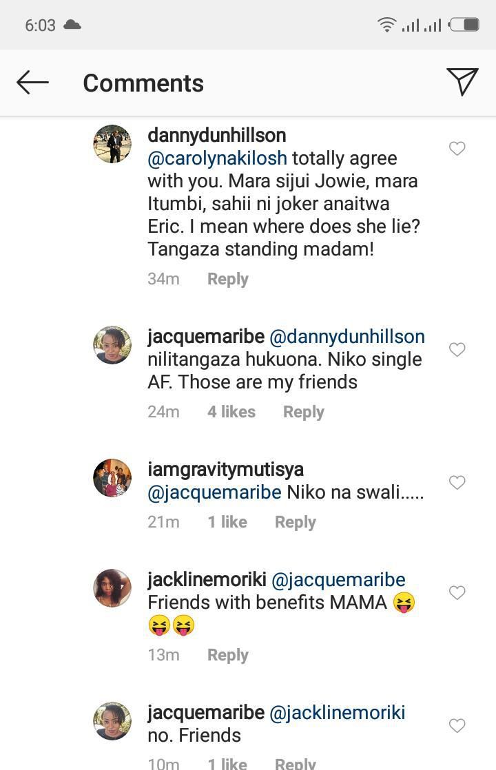 Ms Maribe who saw the comment and had all the time to respond said that she had announced that she is single and they are all her friends.
