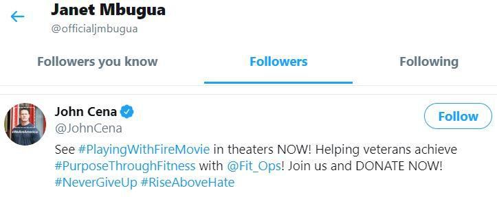 Janet Mbugua’s reaction after John Cena followed her on Twitter
