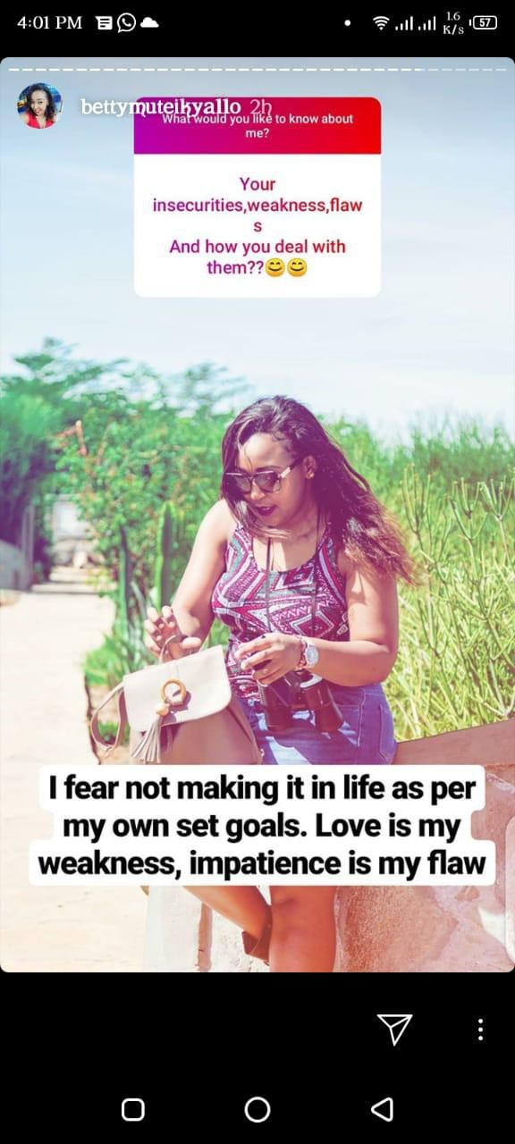 Ms Kyallo who was responding to questions from her fans on Instagram said the words when a fan asked to know her insecurities, weakness, flaws and how she gets to deal with them.
