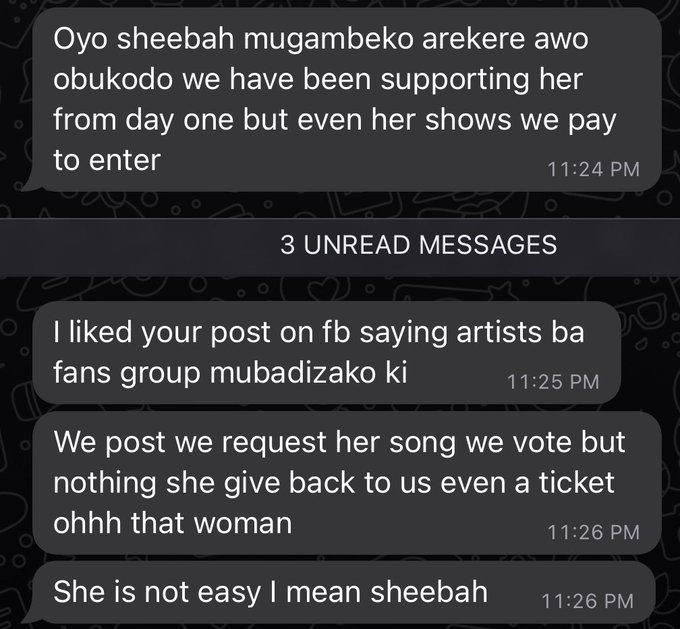 In the conversation, the fan confides in Kats to ask Sheebah to stop being stingy, as fans have been supporting her from day one, yet they still have to pay to enter her shows.