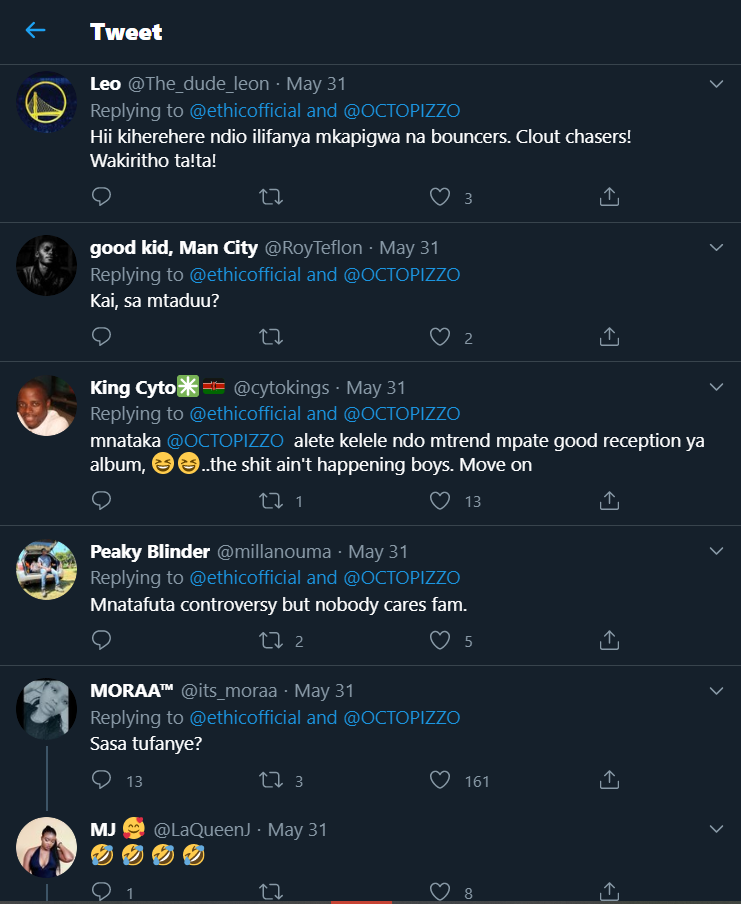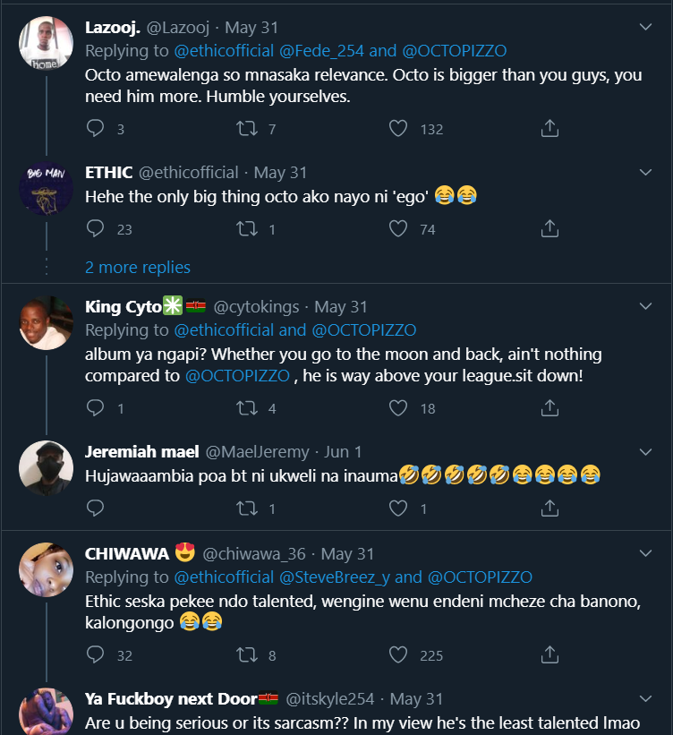This comes days after Octopizzo threw shade at them, for saying Khaligraph Jones is greater than him in one of their tweets.