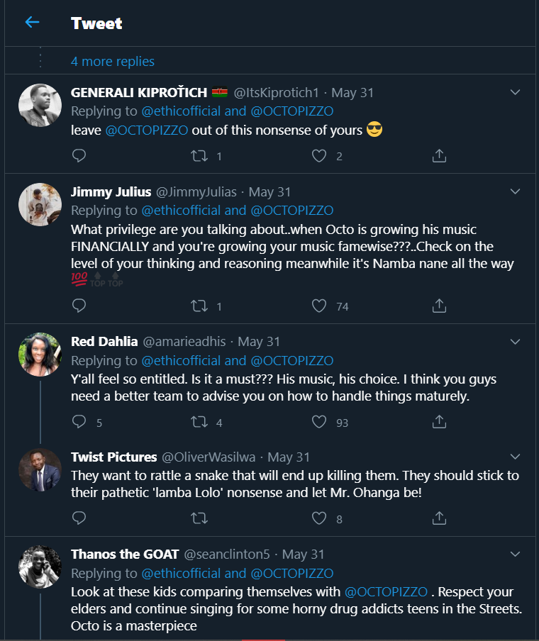 However, the act of Ethic picking fights with Octopizzo did not please a number of their followers and fans, who opted to lecture them.