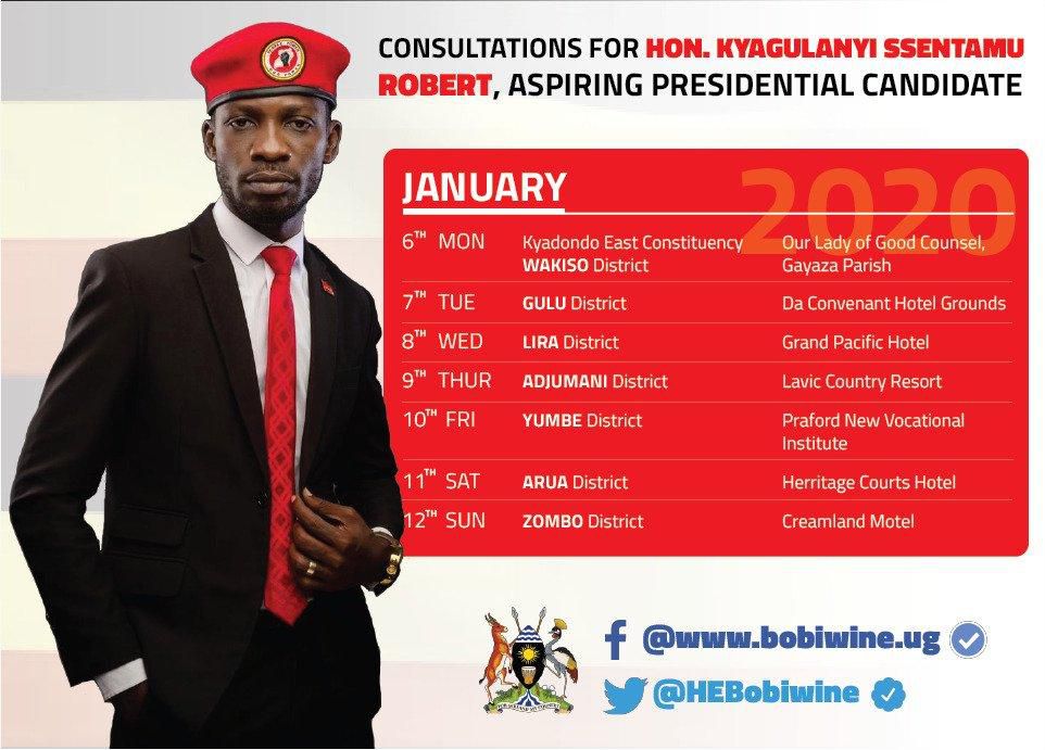 “We begin consultations from home in Kyadondo East on Monday, and then go to six districts in Northern Uganda. Having complied with all legal requirements, our hope is that security agencies will not interrupt our activities! #Mission2021,” tweeted Bibi wine.