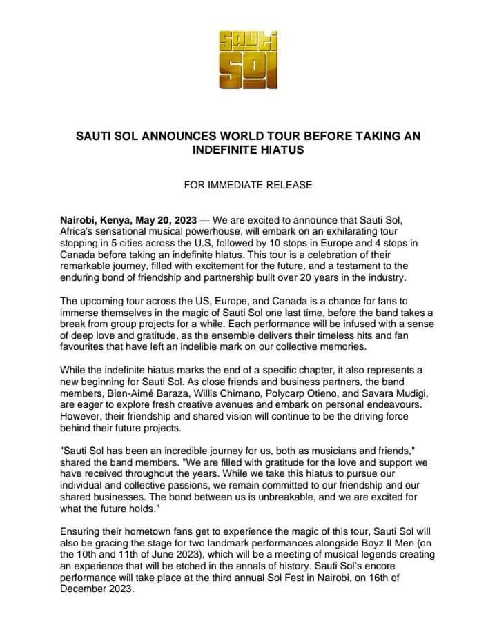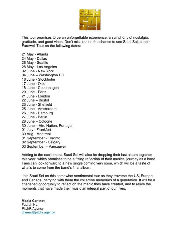 "The upcoming tour across the US, Europe and Canada, is a chance for fans to immerse themselves in the magic of Sauti Sol one last time before the band takes a break from group projects for a while," read the statement.