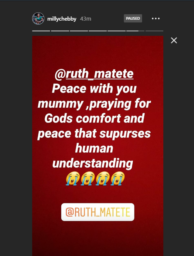“@Ruth_Matete Peace with you mummy, praying for Gods comfort and peace that supurses hum understanding” shared Ruth Matete’s friend Milly Chebby.
