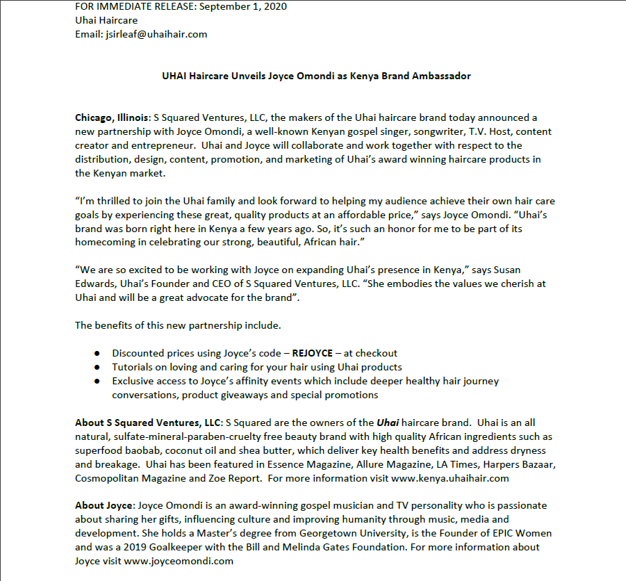 “We are so excited to be working with Joyce Omondi on expanding Uhai’s presence in Kenya. She embodies the values we cherish at Uhai and will be a great advocate for the brand,” said Susan Edwards, Uhai’s Founder and CEO of S Squared Ventures, LLC.