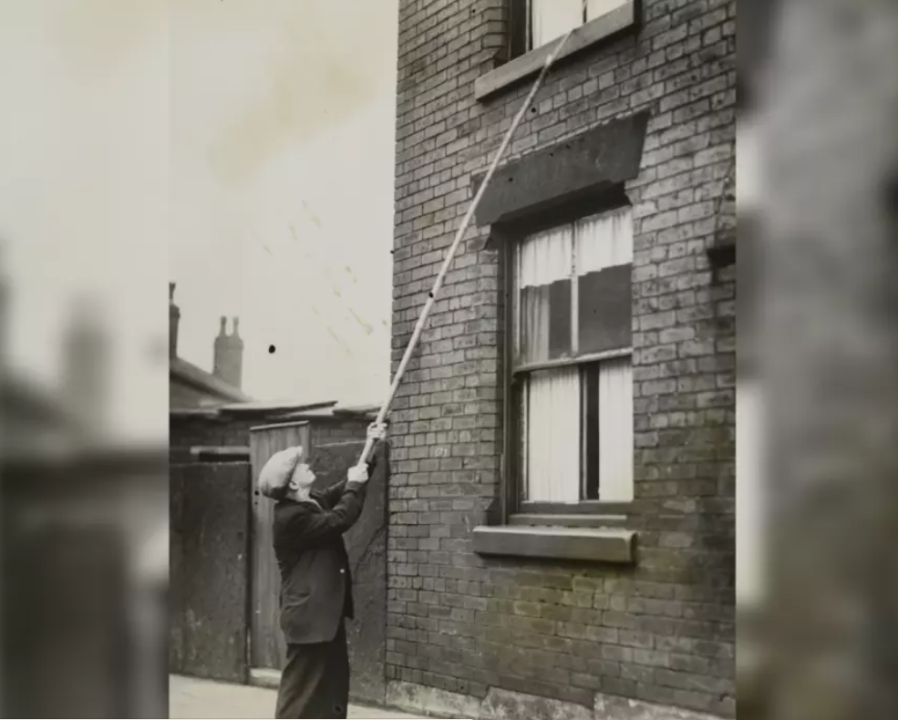 This was the name given to a human alarm clock. Before 1847 when the mechanical alarm clock was invented, people used to hire "knockeruppers" to wake them up in the morning. They would either tap the window with a pole or throw peas at the window glass.
