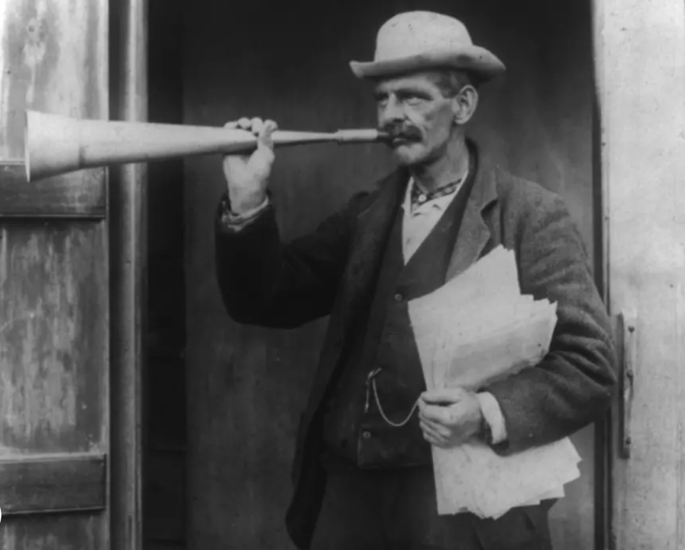 Since most people in the medieval times were illiterate, the town crier was in charge of reading out loud news, proclamations, among other information. He would then post the publication on the door of an inn. This is where some newspapers got their title "The Post".