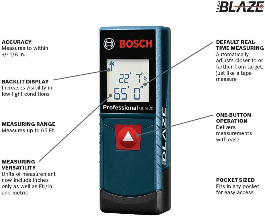 The traditional tape measure carries a certain amount of injury risk not to mention the twists of straightening it. The BOSCH GLM20 Blaze 65ft laser distance measure helps with real-time measuring. It measures long distances with extreme accuracy in meters, feet inches, or inches. It can fit in your pocket and adjusts as you move away or towards the target even in dark areas. It has a backlit display that is easily readable in the dark.