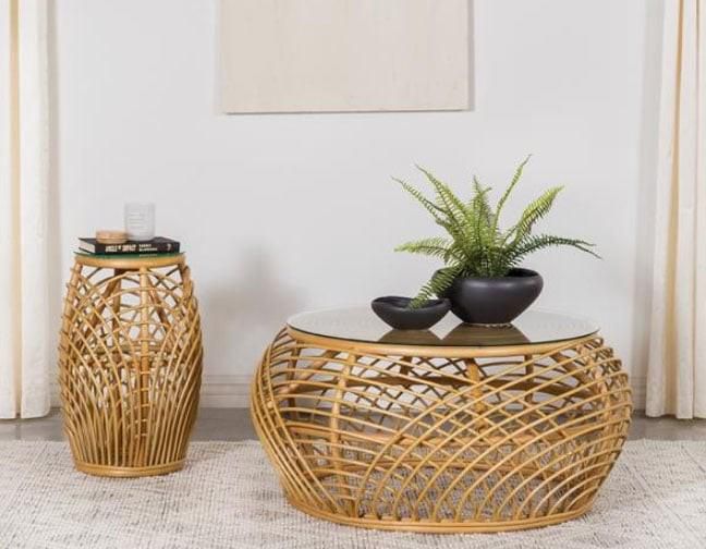 A round or oval rattan coffee table offers both style and functionality. The woven base adds warmth and texture, while the glass top keeps the space feeling open and airy. This versatile piece works beautifully in living rooms, family rooms, or even sunrooms.