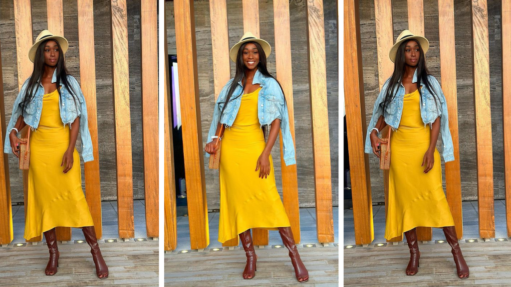 Mixing more than two textures in one outfit can be a fashion fit. Not to mention making it work for the better. Heard rocks brown boots, a satin yellow dress, a denim jacket, a craft-detail purse and a sun hat. And instead of looking "a bit much" it works just well.