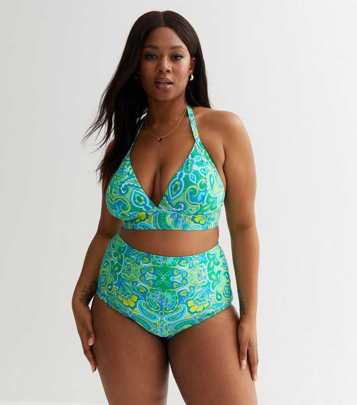 - Wear bikini tops with bold prints or patterns. This can draw attention upward and away from the midsection.