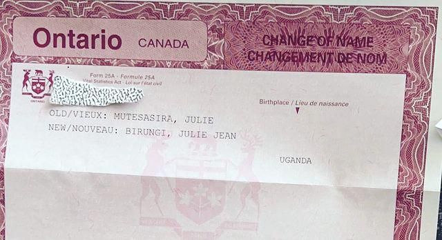 She accompanied the announcement with a picture of the document officiating her new name. The name change was done in Ontario, Canada according to the document details, which also show Uganda as her birthplace.