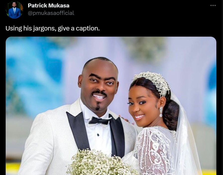 Journalist Patrick Mukasa dared Twitter to, "Using his jargon, give a caption." for the couple's wedding picture.