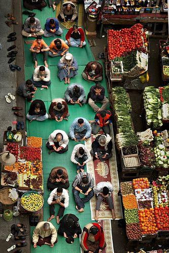 Muslims taking a break from work beside their stalls to pray during Ramadan