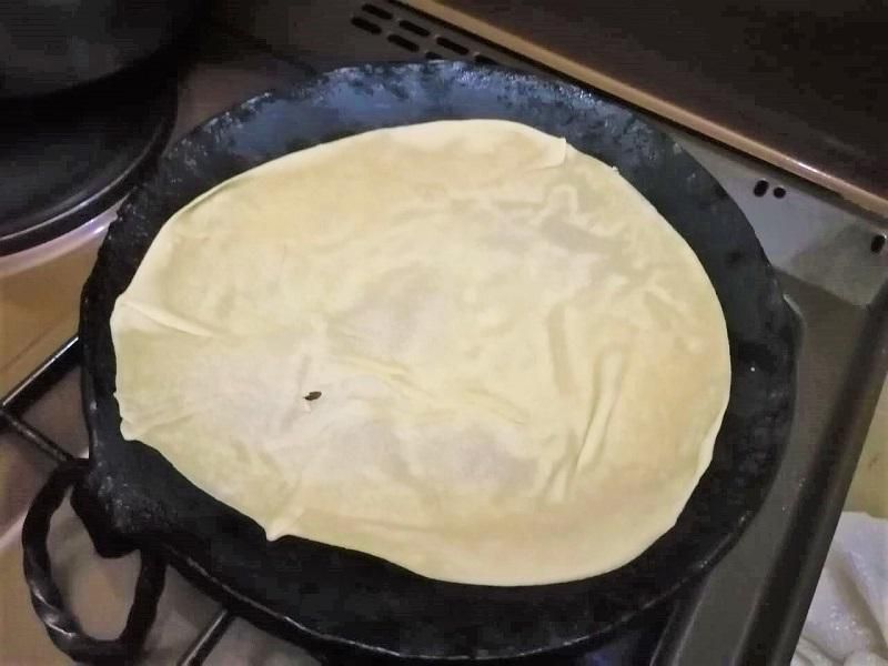 - Divide the dough into 20g balls, our dough produced 7 balls. Using a rolling pin, dust a clean flat surface with some of the leftover flour and spread each ball into a thin circle or near-circle shape. Heat up a flat pan and place the circle dough to cook for 30sec on each side to reduce stickiness.