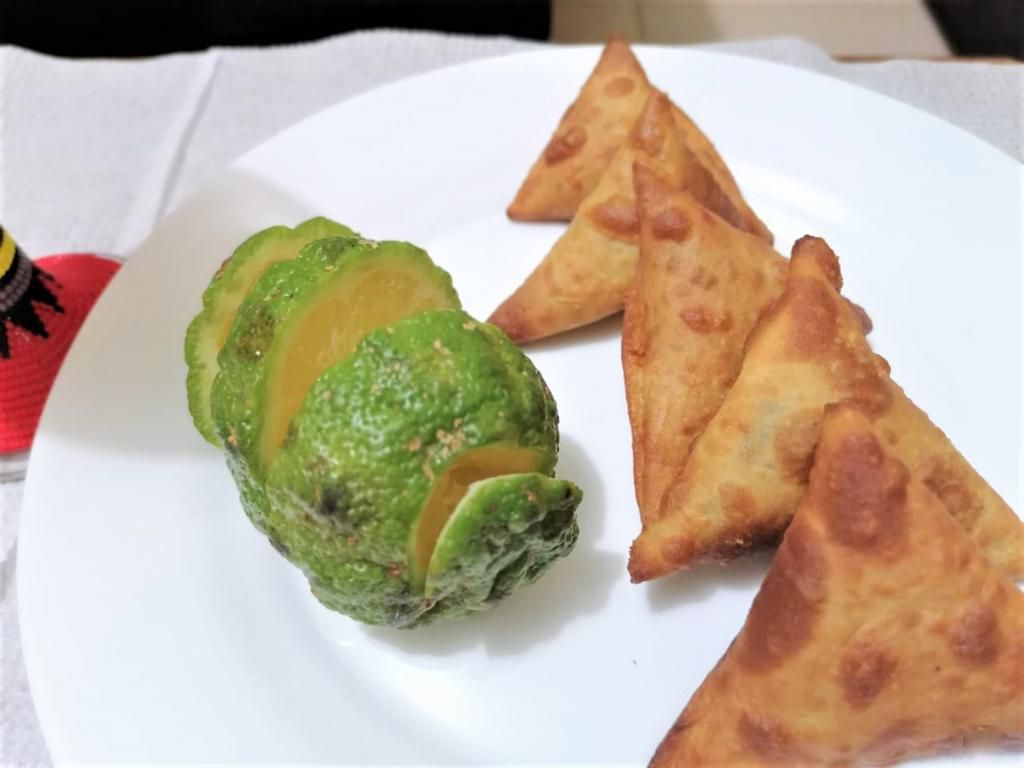 - When all shells are folded into triangles and filled with the cooled stuffing made earlier, deep fry the samosas. Serve with a slice of lemon because the lemon juice pairs beautifully with ginger!