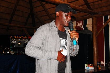 Ssebolule, Uganda's foremost Luganda poet, at Stand-up and Slam poetry/comedy event in Arena Bar and restaurant, Kisimenti, Kampala, 2019.