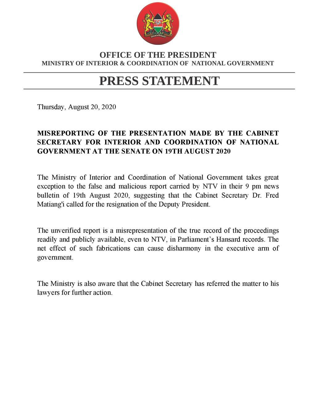 Interior Ministry has responded to a story by NTV that suggested Cabinet Secretary Fred Matiang'i asked Deputy President William Ruto to resign.