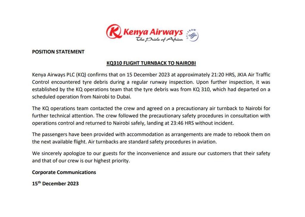 "Upon further inspection, it was established by the KQ operations team that the tyre debris was from KQ 310, which had departed on a scheduled operation from Nairobi to Dubai," KQ revealed in a statement.