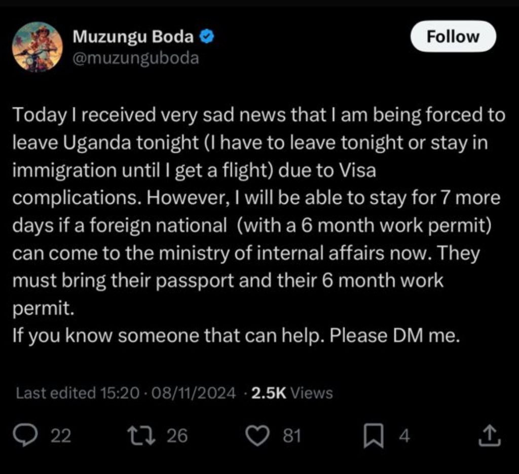 Over the past weeks, Muzungu Boda had used his social media platforms to appeal for support to prevent his deportation, but ultimately, the decision to deport him was finalised.