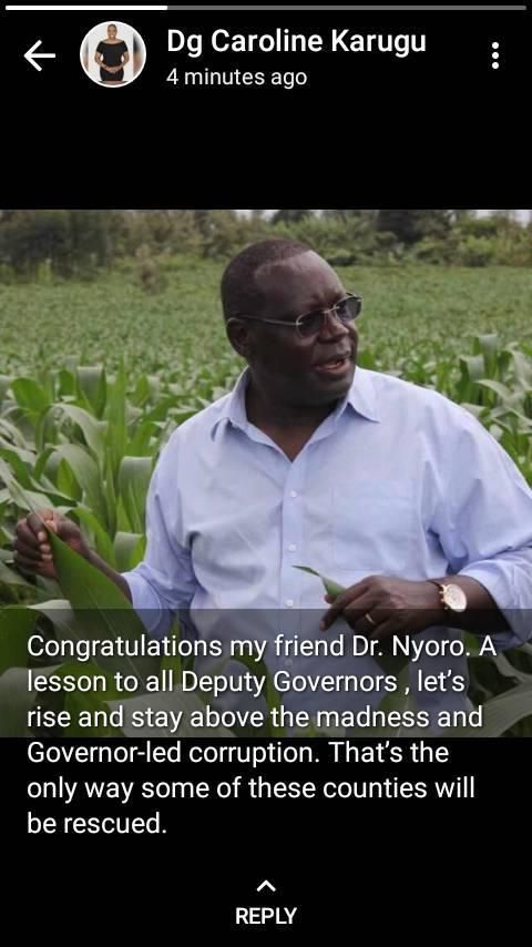 “Congratulations my friend Dr Nyoro. A lesson to all Deputy Governors, let’s stay above the madness and the Governor-led corruption. That’s the only way some of these counties will be rescued,” the controversial status read.