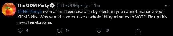"Why would a voter take a whole thirty minutes to VOTE. Fix up this mess haraka sana," the statement from ODM read in part.