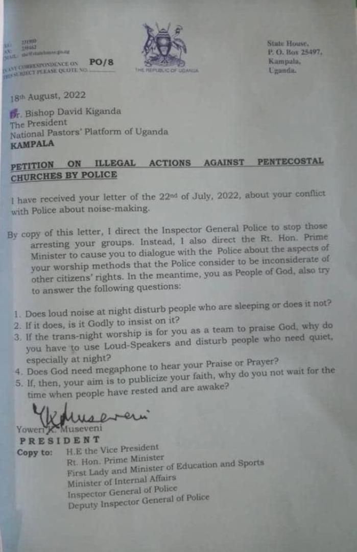 In the letter addressed to Pastor David Kiganda, Museveni invited the Born-again church to answer 5 key questions about noise pollution: