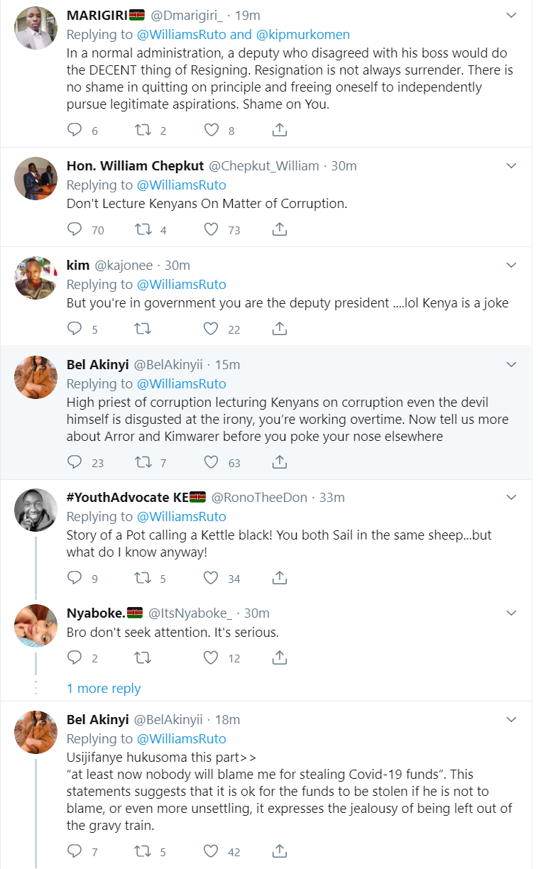 Other pointed out that with his name and those of his allies featuring in almost every corruption scandal, Ruto is not the best person to advice or condemn matters corruption.