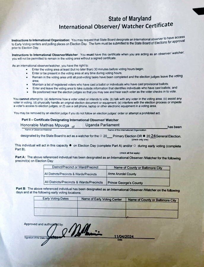 Mpuuga was set to join a team of global observers in Maryland to witness the electoral process in action.