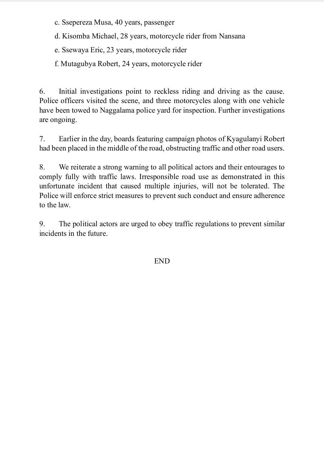 “Preliminary reports indicate that one motorcycle in the convoy, travelling at high speed, collided with a vehicle from behind, triggering a chain reaction where multiple motorcycles crashed into one another. Following this, a white Mitsubishi vehicle, registration number UAZ 064H, displaying images of the aspirant, also collided with the motorcycles involved in the crash,” the Police statement read.
