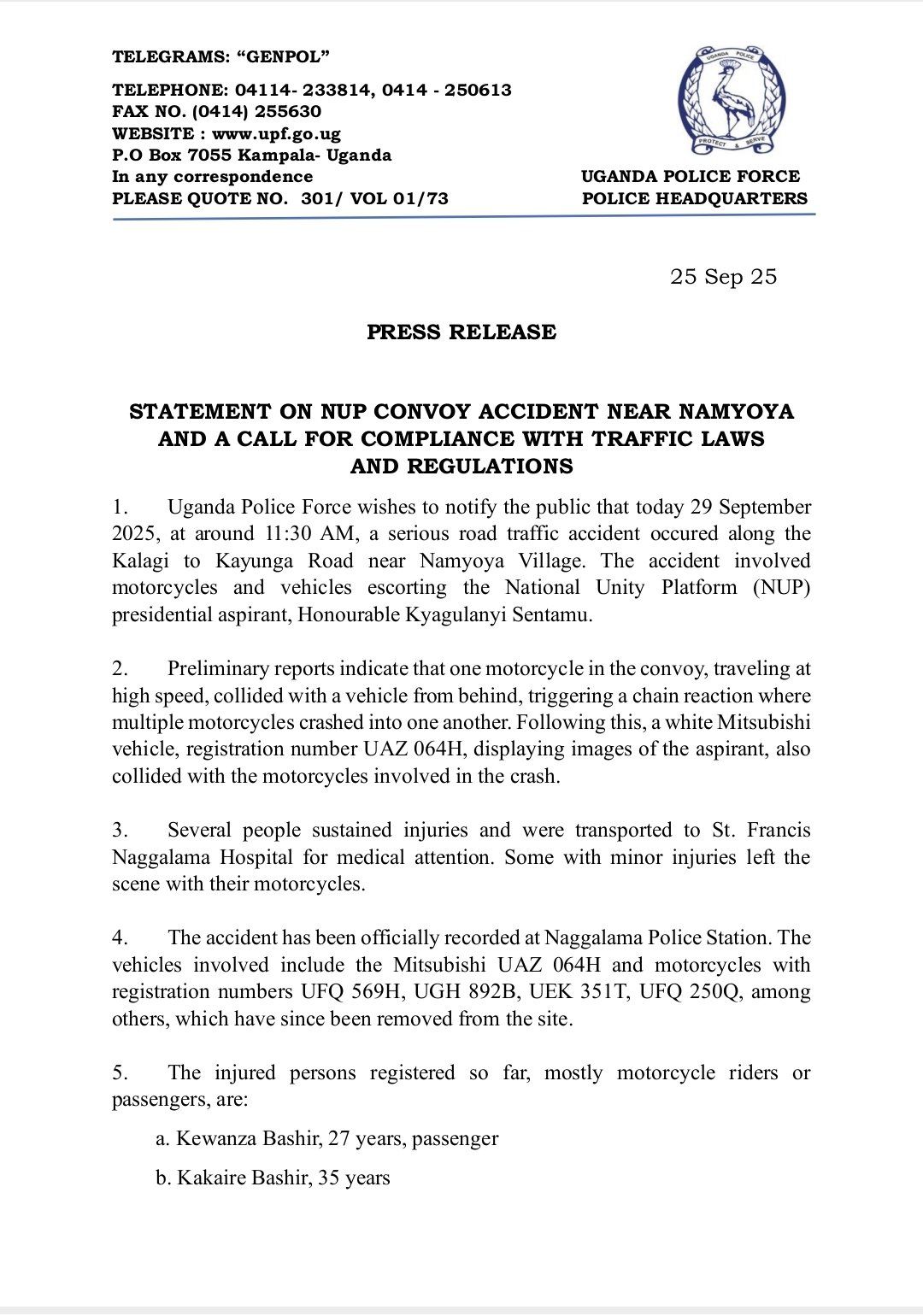 The Uganda Police Force has confirmed that several people were injured in a road accident involving the convoy of National Unity Platform (NUP) presidential aspirant, Honourable Kyagulanyi Sentamu, on September 29 2025.
