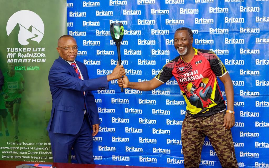Amos Wekesa hands over the marathon torch to Allan Mafabi, the Britam CEO