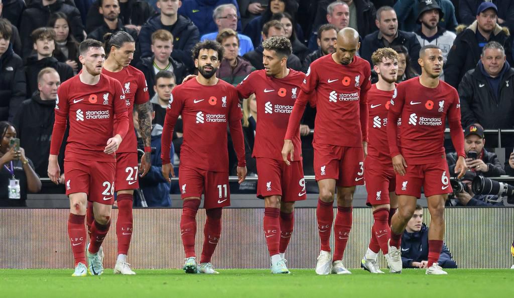 Liverpool players celebrate a goal against Spurs in the Premier League