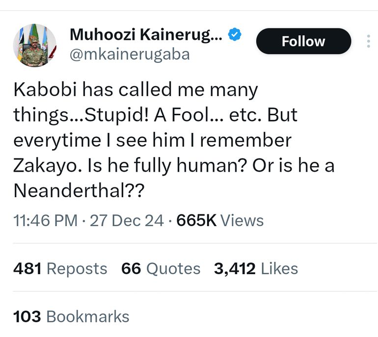 Muhoozi also aimed some barbs at Bobi Wine in the rants, referring to him as a Neanderthal and how he reminded him of Zakaayo, the famous chimpanzee.