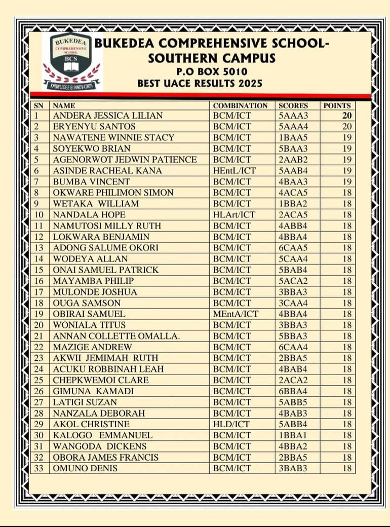 A list released by the school shows several candidates scoring top points in the national exams. Two students, Andera Jessica Lilian and Eryenyu Santos, each scored 20 points in the BCM/ICT combination, placing them among the best performers at the institution.