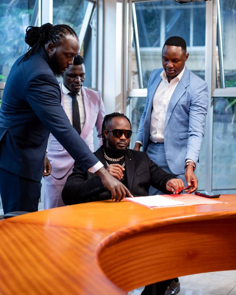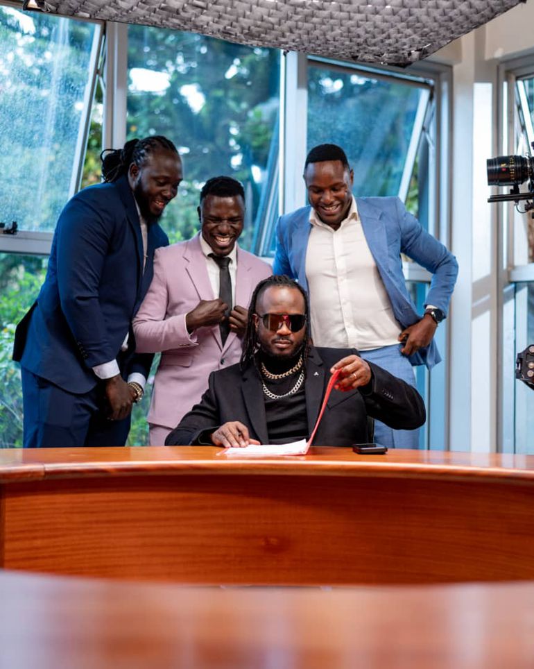 The story then unfolds, showing a younger Bebe Cool in a series of dramatic scenes: in the depths of a mine with his team, in a high-stakes office signing documents, and finally, being arrested by the police.