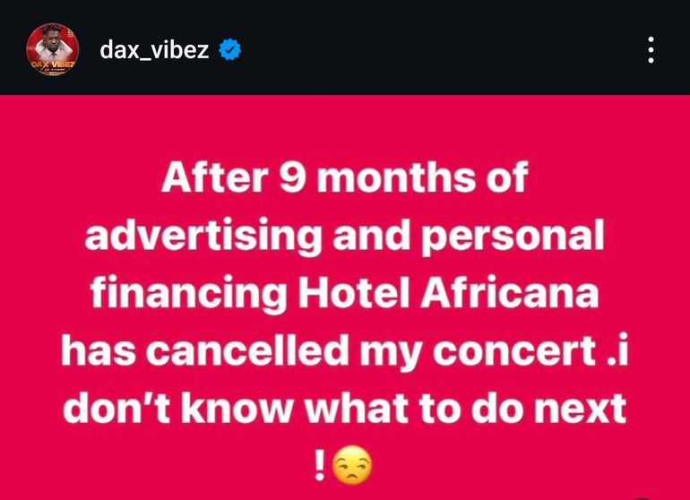Dax Vibez has announced that his concert which was slated for August 29 has been cancelled.