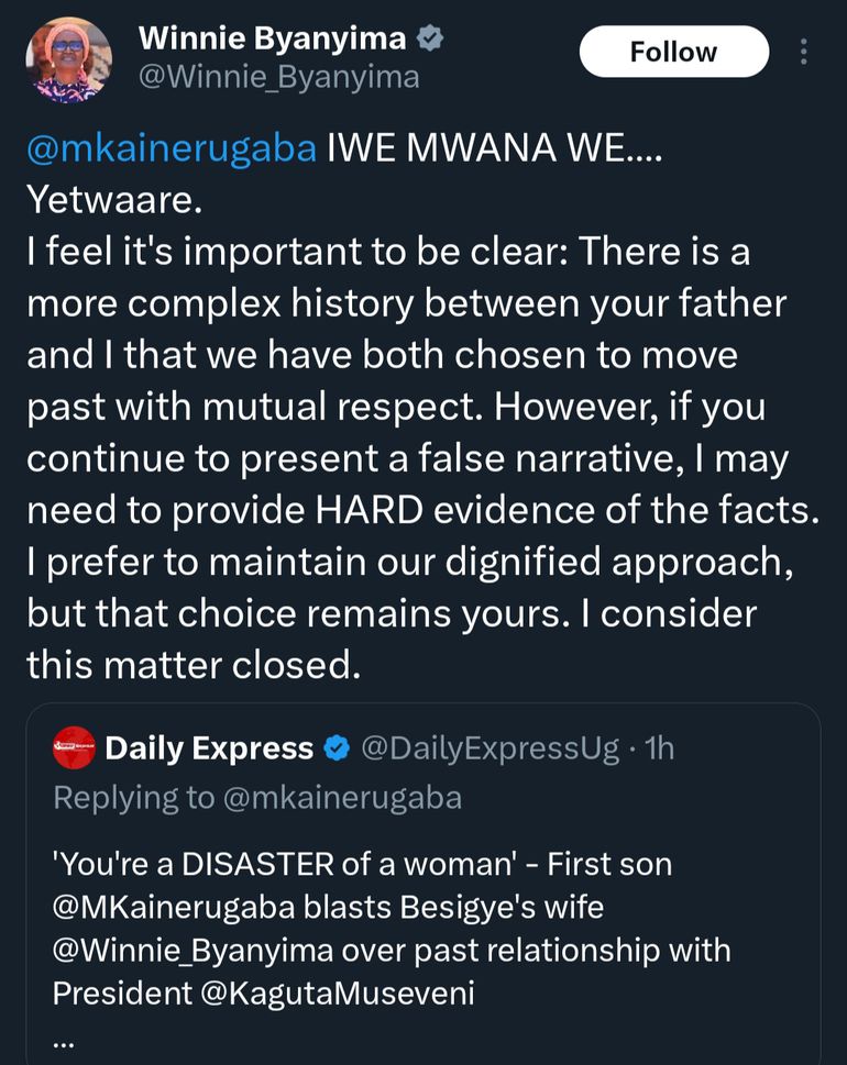 "@mkainerugaba IWE MWANA WE…. Yetwaare. I feel it's important to be clear: There is a more complex history between your father and I that we have both chosen to move past with mutual respect," Byanyima posted on X.
