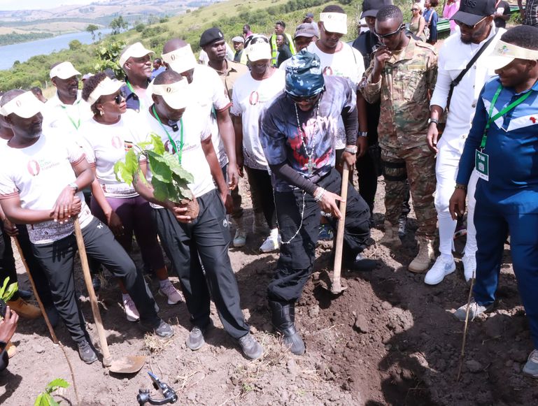 The Tanzanian singer took part in a ceremonial coffee planting on the plantation overlooking the lake.