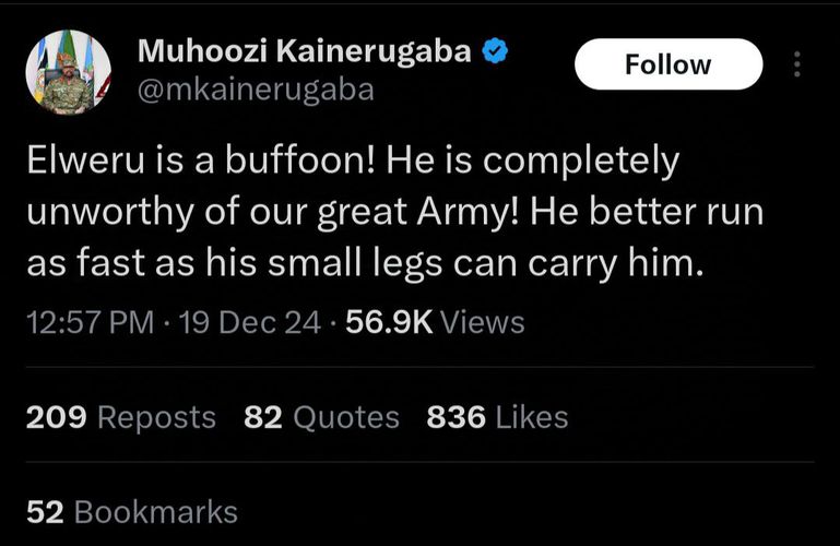 "Elwelu is a buffoon! He is completely unworthy of our great Army! He better run as fast as his small legs can carry him," Gen. Kainerugaba, who also serves as the Senior Presidential Advisor on Special Operations, wrote on X on Thursday, 19 December.