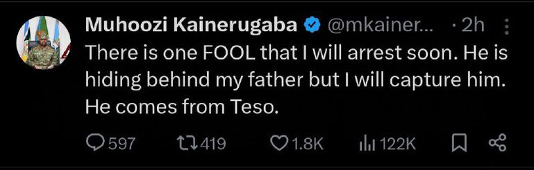 In an earlier post, the CDF stated: "There is one FOOL that I will arrest soon. He is hiding behind my father, but I will capture him. He comes from Teso."