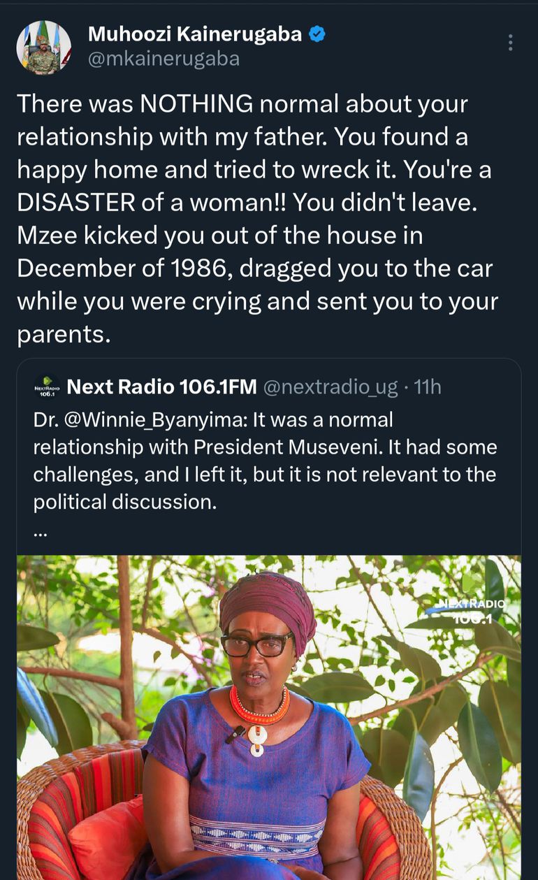 Gen Kainerugaba, who is a son of President Museveni, was reacting to a post by Next Radio, which quoted Byanyima as saying: